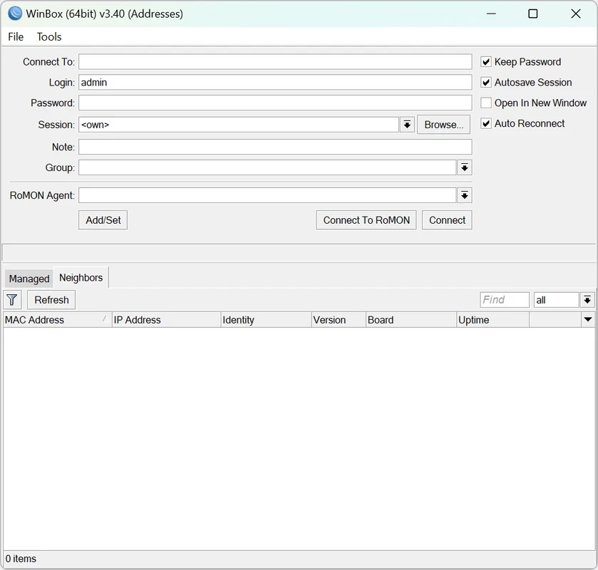 Die App lässt sich einfach installieren: Laden Sie das Installationsprogramm von der offiziellen Website herunter oder klicken Sie auf den „Download“-Button auf dieser Seite. Folgen Sie den Anweisungen auf dem Bildschirm, um die Installation abzuschließen. Starten Sie die App per Doppelklick auf das Symbol, geben Sie die IP-Adresse oder den Hostnamen Ihres MikroTik-Routers ein und stellen Sie die Verbindung nach Eingabe der gültigen Zugangsdaten her.